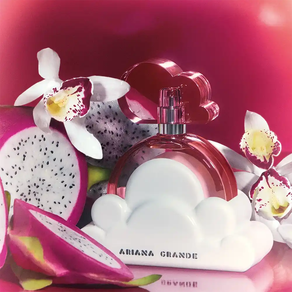 Cloud Pink es una versión más frutal, dulce y luminosa que el Cloud original. Tiene ese toque “nube esponjosa” típico de Ariana Grande, pero más tropical gracias al uso de frutas exóticas como pitahaya (dragon fruit), piña y bayas. En lugar de que lo dulce domine desde el inicio, se mezcla con notas más cremosas y tropicales como coco y vainilla orquídea, lo que le da suavidad al perfume.