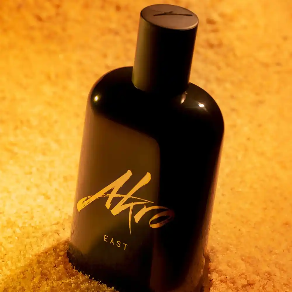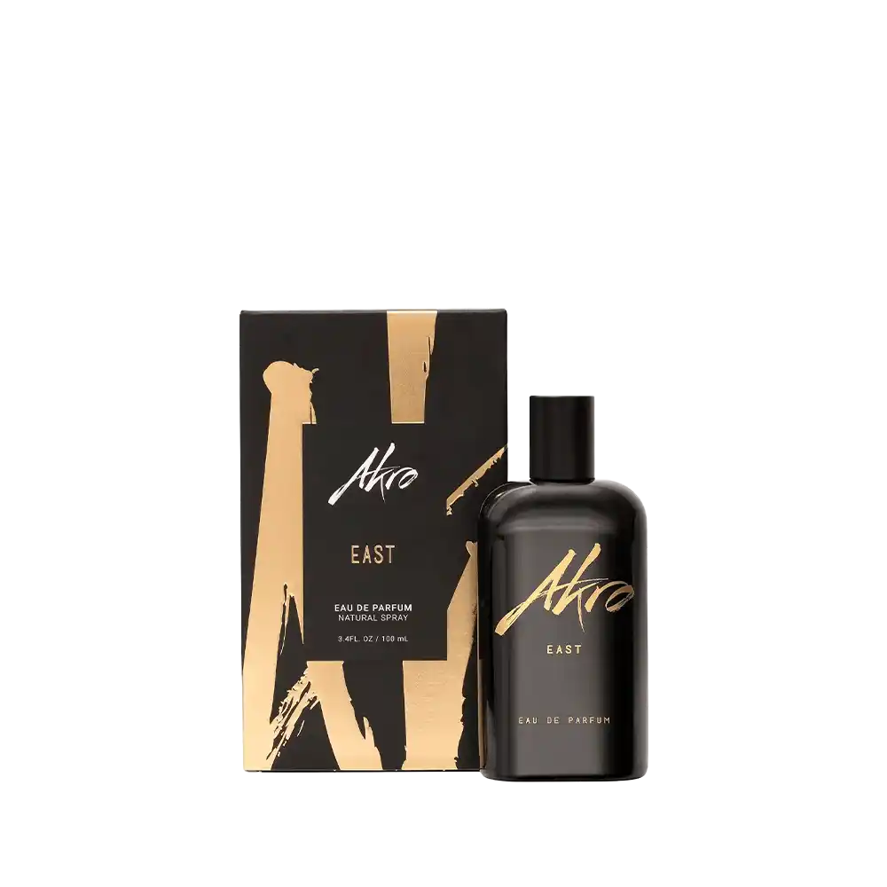 East Eau de Parfum de la casa Akro es una fragancia unisex de la familia olfativa amaderada. Fue lanzada en 2023 y creada por el perfumista Olivier Cresp, inspirándose en los viajes por el Medio Oriente. Evoca los aromas de los grandes desiertos y los enérgicos mercados callejeros de la región, combinando la mística del oud con sensibilidades occidentales.